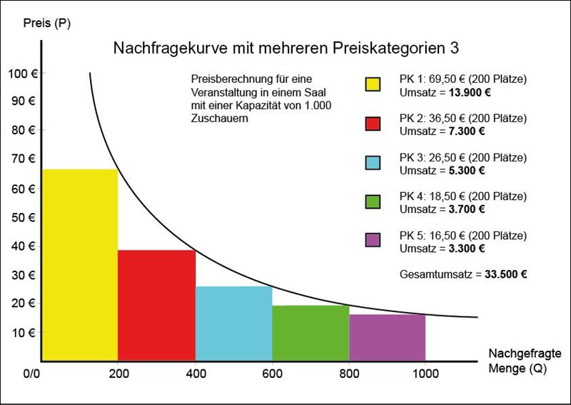 Die Preiselastizität beschreibt, wie stark sich die Nachfrage bei einer Preisänderung verändert. Ein zu hoher Preis kann Besucher abschrecken, ein zu niedriger Preis schöpft das Potenzial nicht aus. Ziel ist es, den Punkt zu finden, an dem der Umsatz aus verkauften Tickets und Preisniveau maximiert wird. Dies gelingt am besten durch gestaffelte Preise: Während einkommensstärkere Besucher bereit sind, für Premiumplätze mehr zu bezahlen, können preisbewusste Gäste über günstigere Kategorien dennoch teilnehmen. So erreichen Sie breitere Zielgruppen – und füllen gleichzeitig den Saal.