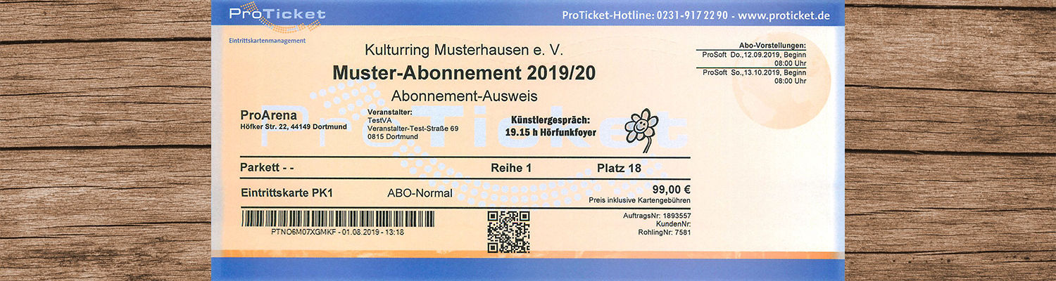 Abonnenten können Abo-Ausweise für die gesamte Spielzeit oder Abo-Einzeltickets pro Termin erhalten. Der Abo-Ausweis ist personalisiert (Name, Abo-Bezeichnung, Spielstätte, Veranstalter, Liste der Termine, Barcode/QR-Code) und kann auf Wunsch als übertragbar konfiguriert werden. Auf Abo-Einzeltickets wird die Ermäßigungsart um die Abo-Bezeichnung ergänzt – eine klare Unterscheidung zum normalen Einzelticket.