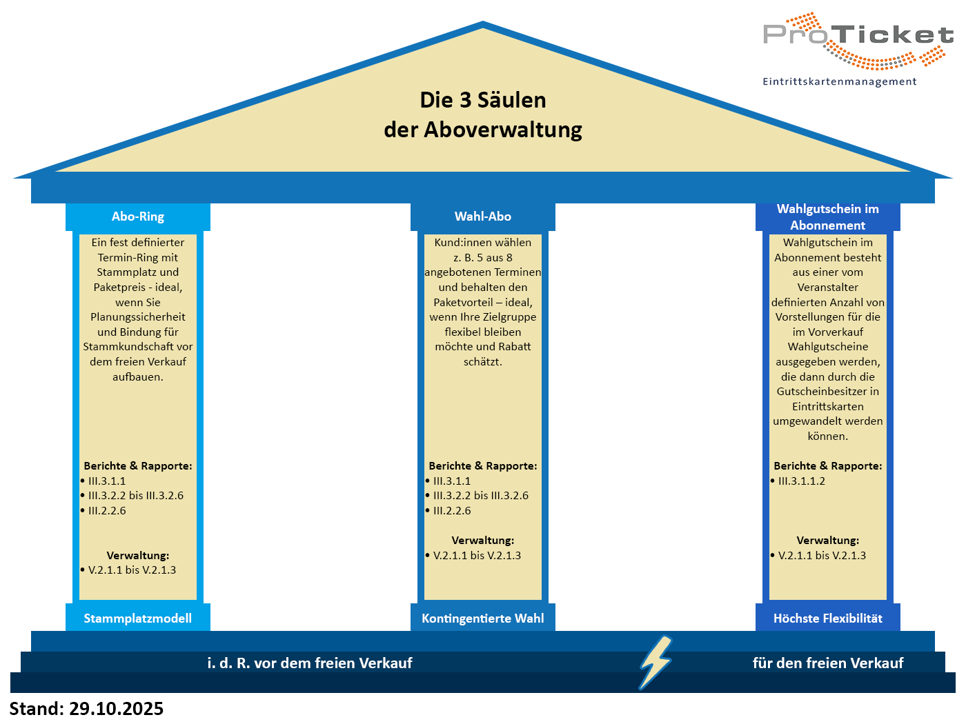 Abonnements lassen sich in die folgende Spielzeit übernehmen – inklusive Berücksichtigung von Kündigungen und identischer Rabattbezeichnungen. Abonnements lassen sich in die folgende Spielzeit übernehmen – inklusive Berücksichtigung von Kündigungen und identischer Rabattbezeichnungen. Je nach Organisationsgrad kann die Übernahme eigenständig manuell bei einer geringen Anzahl von Abonnenten und durch erfahrene Abo-Sachbearbeiter beim Veranstalter erfolgen oder als kostenpflichtige Service-Dienstleistung durch ProTicket beauftragt werden.
